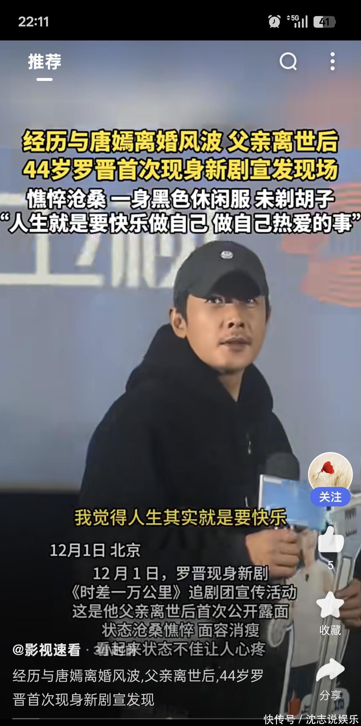 最近网上一直在说罗晋的事情,先是传他和唐嫣离婚,没过多久又听说他爸去世了。按时间算,婚变消息刚出来不到十天,就赶上他12月1号去参加新剧《时差一万公里》的路演。那天他穿着黑外套,戴着鸭舌帽,脸上全是胡茬,背都驼了,粉丝看见都说差点没认出来。